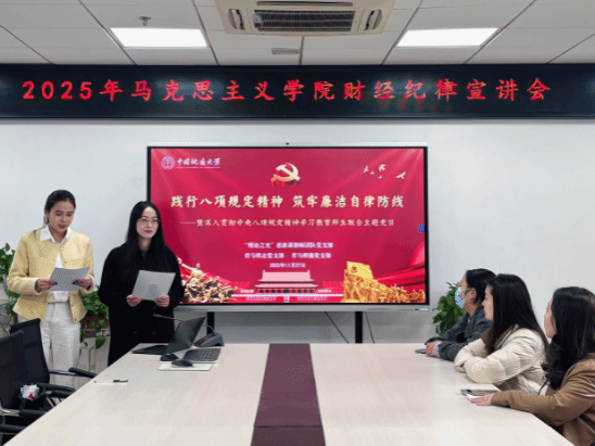 2025年11月27日下午,“理论之光”党支部联合结对领航的青马明志、青马明德员工党支部,于东区教学综合楼B1013召开“践行八项规定精神 筑牢廉洁自律防线——暨深入贯彻中央八项规定精神学习教育师生联合主题党日”活动。活动由专题党课、心得交流、视频学习、总结致辞等环节构成,活动由“理论之光”思政课教师团队党支部书记李蔚然与青马明德党支部委员李书乐主持,40余名师生党员齐聚一堂,共同筑牢廉洁自律的思想防线。