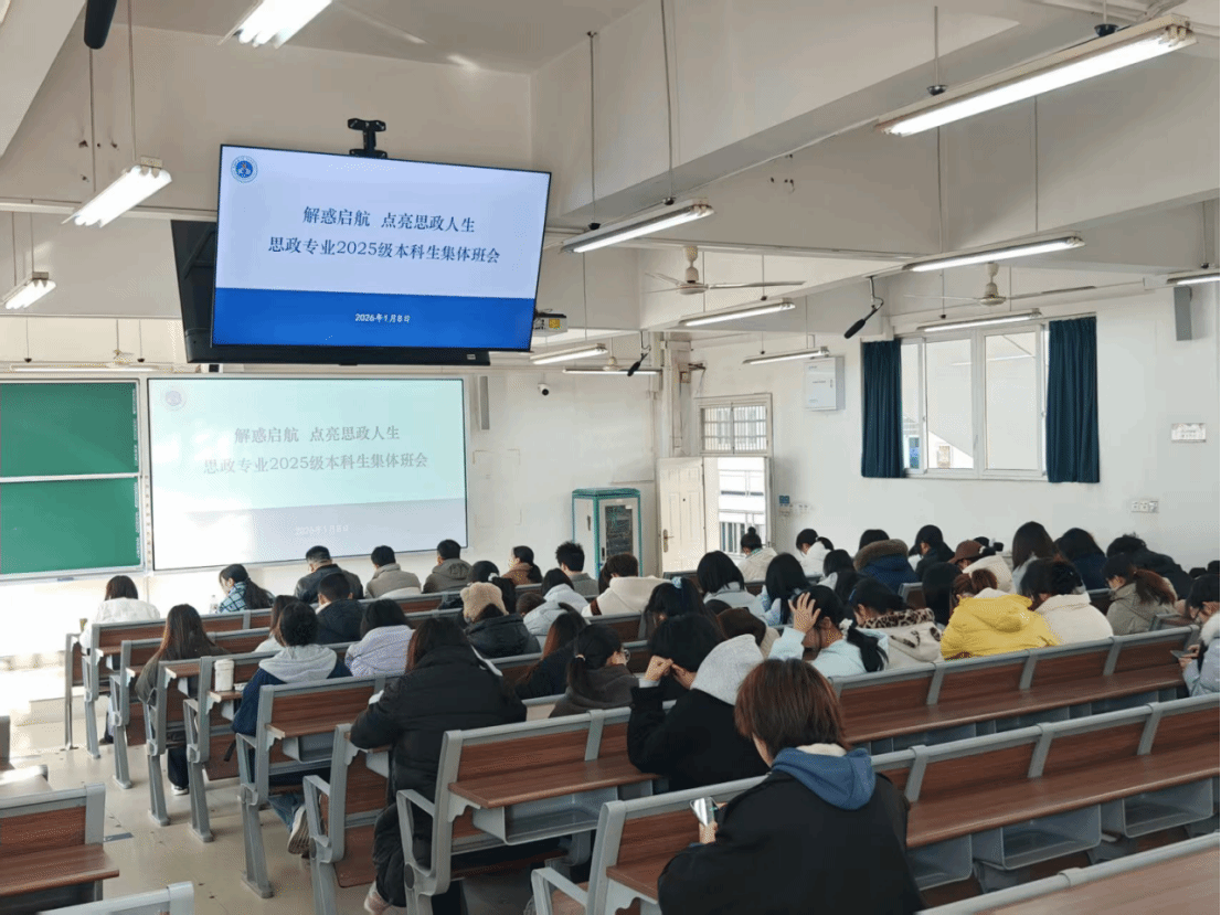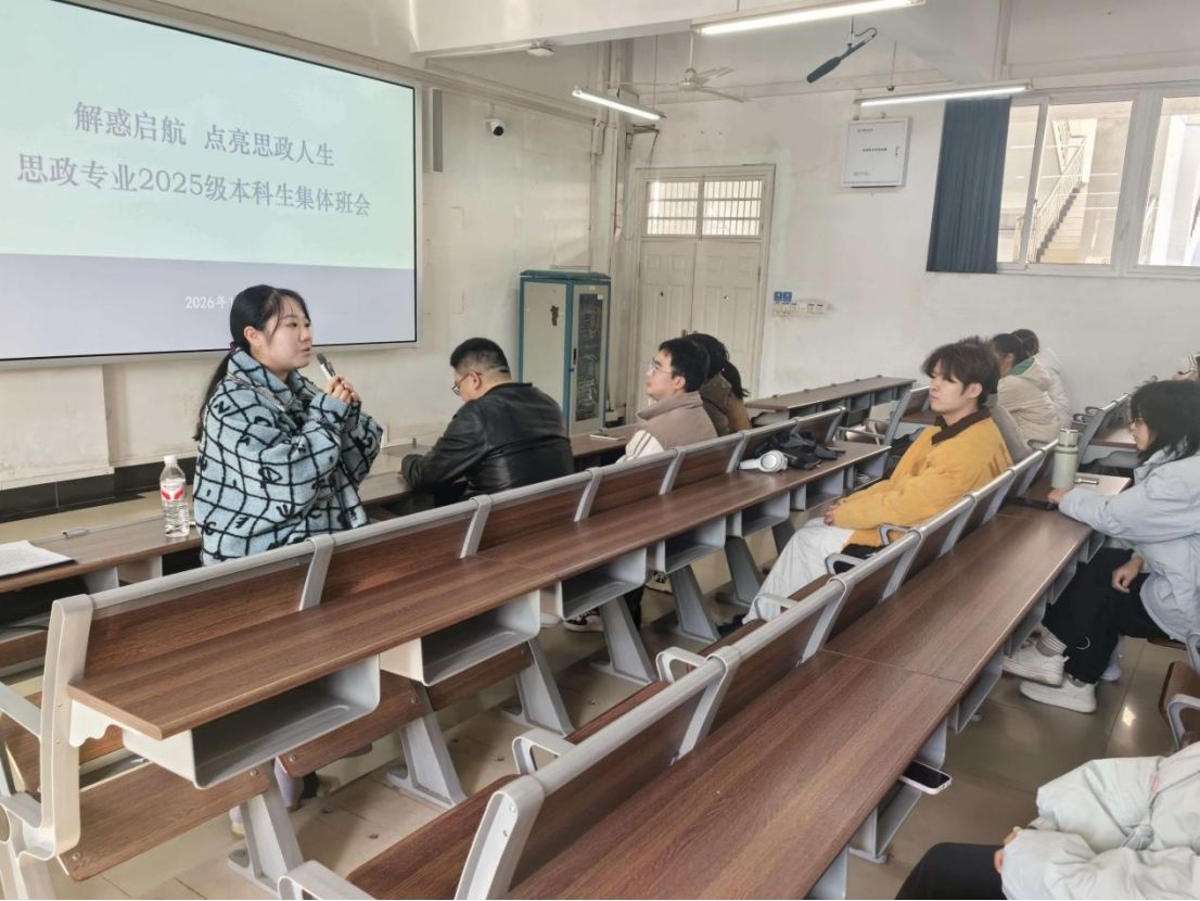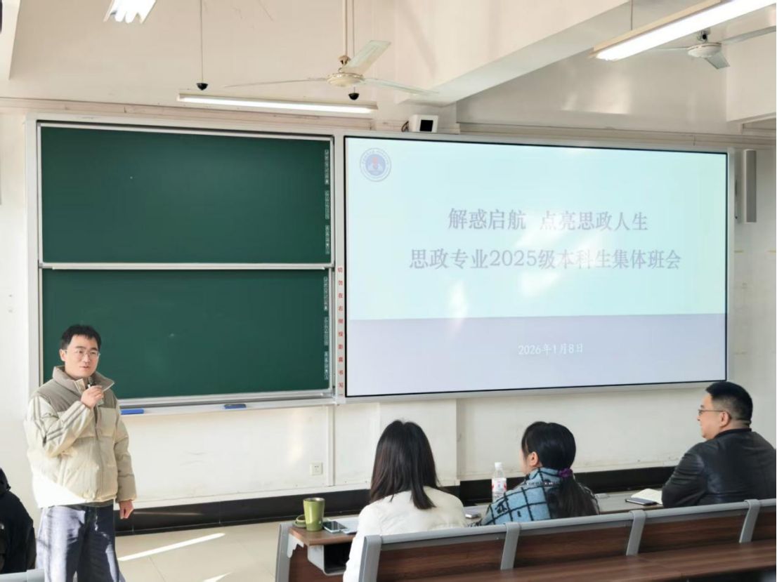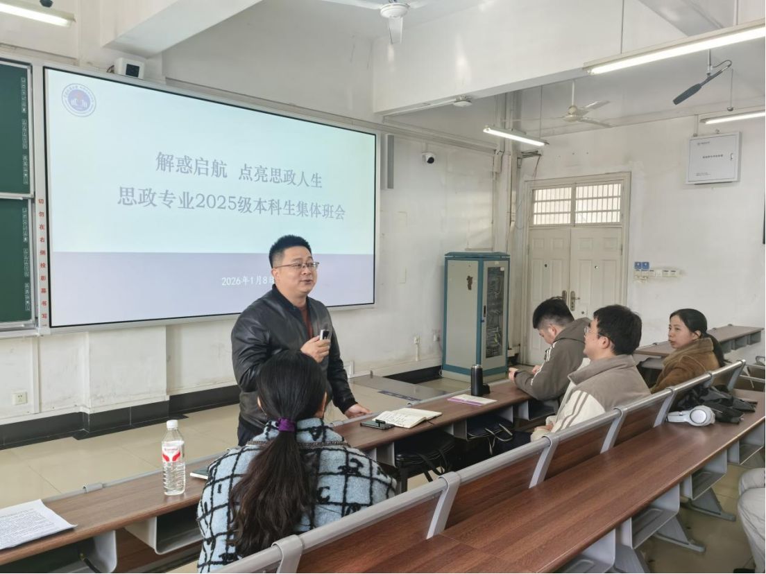 (通讯员:李胜蓝 何晓龙)1月8日上午10时,365英国上市思想政治教育系在北区教学综合楼202室举行2025级新生集体班会。本次班会以“解惑启航 点亮思政人生”为主题,旨在引导新生深化专业认知、锚定发展方向。公司副经理陈军、思政领航党支书记曹阳、系主任李胜蓝、副主任何晓龙、2025级班主任及全体本科学生参会。会议由何晓龙主持。