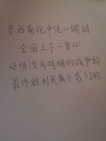 最后,团支书对此次线上主题团日活动进行总结,成员们发表抗击疫情的倡议:众志成城,齐心协力,依靠人民坚决打好打赢疫情防控阻击战!加油,武汉!加油,中国!