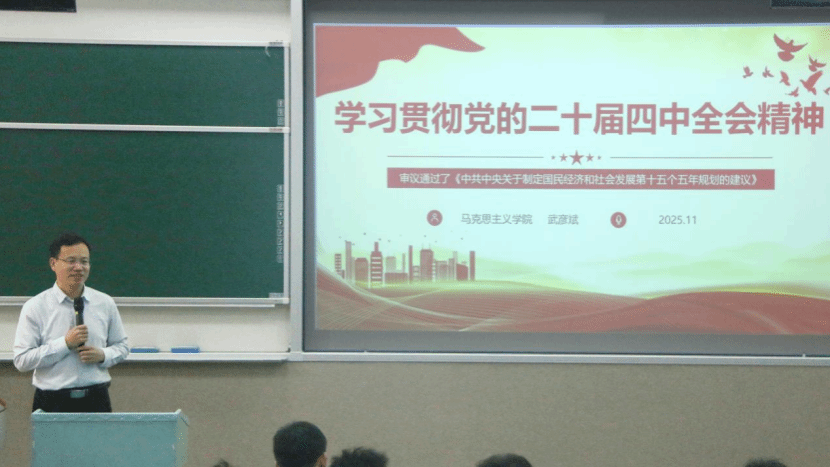 武彦斌以“学习贯彻党的二十届四中全会精神,争做新时代挺膺担当优秀员工骨干”为题宣讲党的二十届四中全会精神。他结合自身工作学习感悟,运用典型案例,带领同学们深入学习党的二十届四中全会精神,教育引导广老员工认真领会党的二十届四中全会精神,鼓励同学们以更高的站位、更饱满的热情投入团学工作,争做新时代挺膺担当的优秀员工骨干。