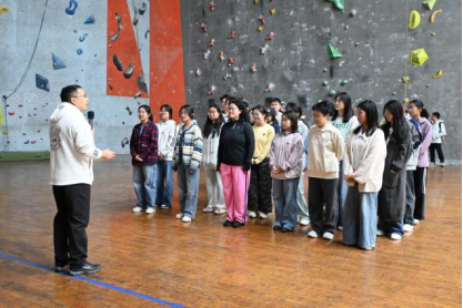 上午10:00,体能强化培训在西区攀岩馆进行。体育公司党委副书记朱军首先向同学们介绍了地大攀岩运动的历史与荣誉,并安排了8名具备专业知识与技能的体育公司员工带领学员们开展了一场妙趣横生的团建游戏。攀岩体验环节,学员们认真学习专业老师的讲解和指导,严格按照技术要领开展活动。大家彼此支持、互相打气,展现出高度的协作意识和团队精神。