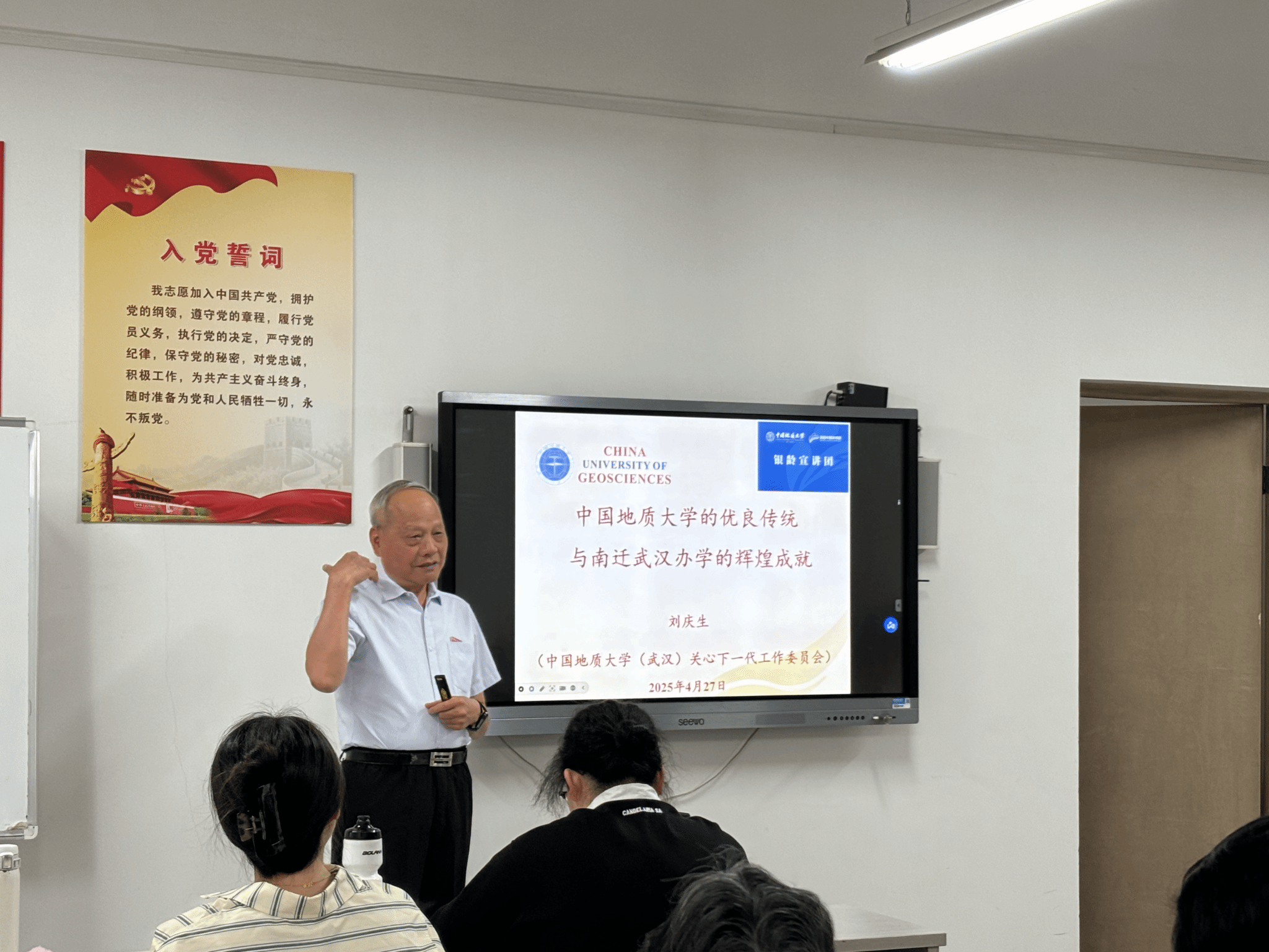 随后,中国地质大学关工委委员、“银龄宣讲团”成员刘庆生老师深情讲述中国地质大学的优良传统以及南迁武汉办学的辉煌历程。从地质先驱“以献身地质事业为荣”的誓言,到南迁时期师生共克时艰的奋斗故事,刘老师用鲜活的历史案例诠释了地大人“艰苦朴素、求真务实”的精神内核,现场听众无不动容。