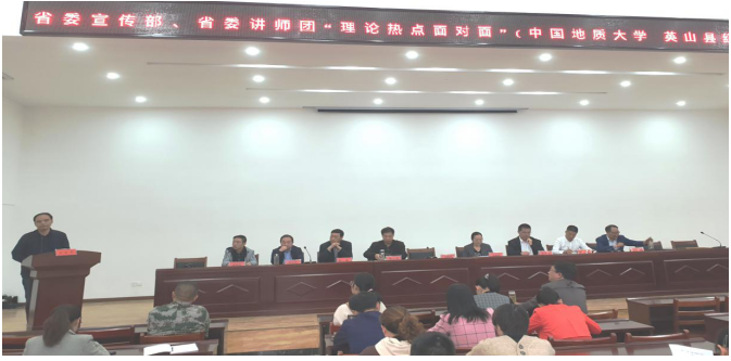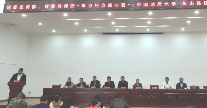 (通讯员孙东震)2019年11月1日,省委宣传部、省委讲师团、中国地质大学“理论热点面对面”示范点授牌仪式暨“不忘初心牢记使命”主题教育宣讲报告会在黄冈市英山县红山镇党员群众活动中心隆重举行。省委讲师团调研员胡秋春、姚官华,英山县宣传部副部长胡天堂,公司党委宣传部副部长陈华文、365英国上市经理高翔莲教授、副经理阮一帆教授、办公室主任胡雪黎,红山镇党委书记陈琼、镇宣传委员徐新生等参加授牌仪式。该镇党员干部和部分群众代表约100人聆听了主题报告并参加授牌仪式。活动由徐新生宣传委员主持。
