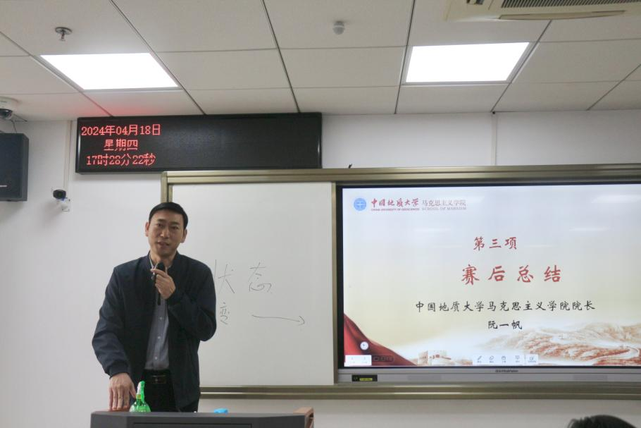 活动最后,阮一帆经理对此次竞赛活动作总结。阮经理首先高度肯定了参赛教师们在此次教学展示中的表现,并对在座专家评委的用心、细致点评以及提出的诸多中肯建议表示感谢。他指出,思政课建设任重道远,思政课教师要以更高的标准来要求自己,充分汲取专家评委的指导建议,对标评委老师提出的各项标准,更好地提升自身的教学能力和育人水平,努力成长为一名优秀的大学思政课教师。